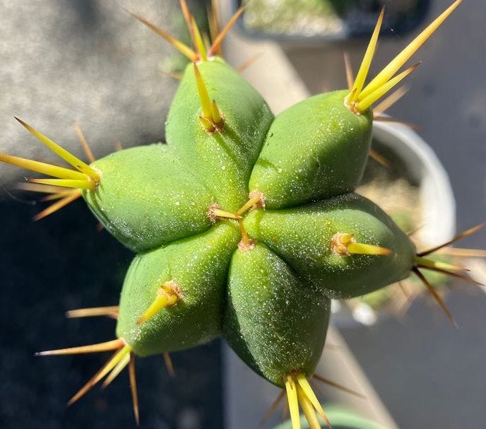 So it was only a matter of time before I would try mescaline. The problem was that mescaline was hard to get. (It’s not, really. I simply made it hard with my reluctance to be dependent on anything other than myself to access medicine. This is more or less why I grew all those mushrooms myself in the first place.) I purchased several San Pedro cacti from a local hobbyist with the goal of a sustainable supply for myself. I promptly grew so attached to the little spiky dudes that I couldn’t imagine cutting them up to consume them. I still haven’t.